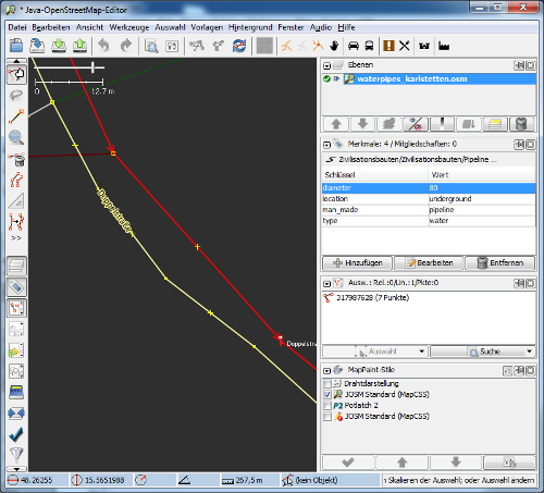 Das Einzeichnen vom Leitungsnetz funktioniert analog zur Hydranten-Anlage mittels JOSM Applikation, lediglich werden statt Punkten zusammenhängende Linien eingezeichnet. Wiederum ist es notwendig pro Linie (pro Leitungszweig) folgende Attribute zu vergeben: