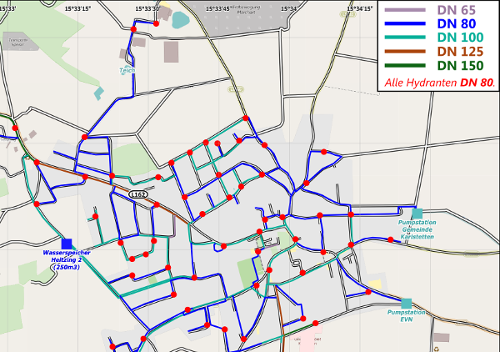 Löschwasserentnahmestellenpläne sind jedoch nicht nur für den Einsatzfall (=abwehrender Brandschutz) relevant, vielmehr werden sie auch im vorbeugenden Brandschutz eingesetzt um Löschwasser-Berechnungen für Objekte durchzuführen oder komplette Ortsteile zu analysieren. Leider bieten LöWa-Pläne auch einen kleinen Nachteil: Die meisten ausgegebenen LöWa-Pläne beinhalten zwar Hydranten, jedoch ist das dazugehörige Ortswasser-Leitungsnetz nicht eingezeichnet. Der Zusammenhang von Hydranten mit einer oder mehreren unterirdischen Zubringerleitungen ist im vorbeugenden Brandschutz von großer Wichtigkeit. Die Angabe des Durchmessers eines Hydranten bzw. der damit verbundenen maximalen Durchflussmenge von LöWa reicht im Normalfall nicht aus. Befindet sich der Hydrant auf einer Ringleitung, wo von zwei Seiten Wasser zuströmt, oder auf einer Stichleitung? Welche Leitungsdurchmesser (=max. Durchflussmenge) bieten die einzelnen Wasserleitungen? Wieviele (im Einsatzfall verwendete) Hydranten befinden sich auf einer gemeinsamen Leitung oder sind voneinander abhängig? Um diese Fragen zu beantworten ist es essentiell den Zusammenhang von Hydranten und dem Ortswassernetz zu kennen.